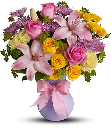 "Graceful and gorgeous" describes this stunning array of pastel flowers in a charming lavender vase tied with a pink satin ribbon. It's almost too pretty for words. But you'll hear many words of praise for sending it.